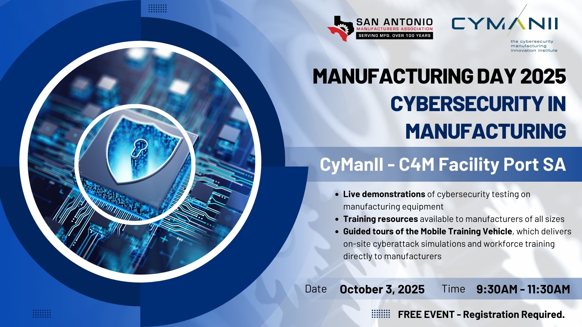 This year, we are proud to host Manufacturing Day℠ at CyManII’s Cybersecurity for Manufacturing (C4M) facility - 638 Davy Crockett Rd., San Antonio, TX 78226, —a national leader dedicated to safeguarding America’s manufacturing sector.